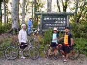 分水嶺まであと数キロという地点になって、サポートカーが追いついて来ました。ここでSyちゃんも、気合いを入れ直して自転車にまたがります。PGS+のメンバとして、あんまりサボってる訳にもいかないのでしょう。ここからはアップダウンの連続です。少々キツイ坂もあるのですが、前後に下りが入るので、それなりのペースで走っていけます。今回初参加組も、交代しながら自転車で次々と坂を越えていきます。「もういい加減にしてくれー」と誰もが思い始めた頃、分水嶺に到着しました。ここまでの所要時間、3時間30分。ちょっとダラダラ遊びすぎました。